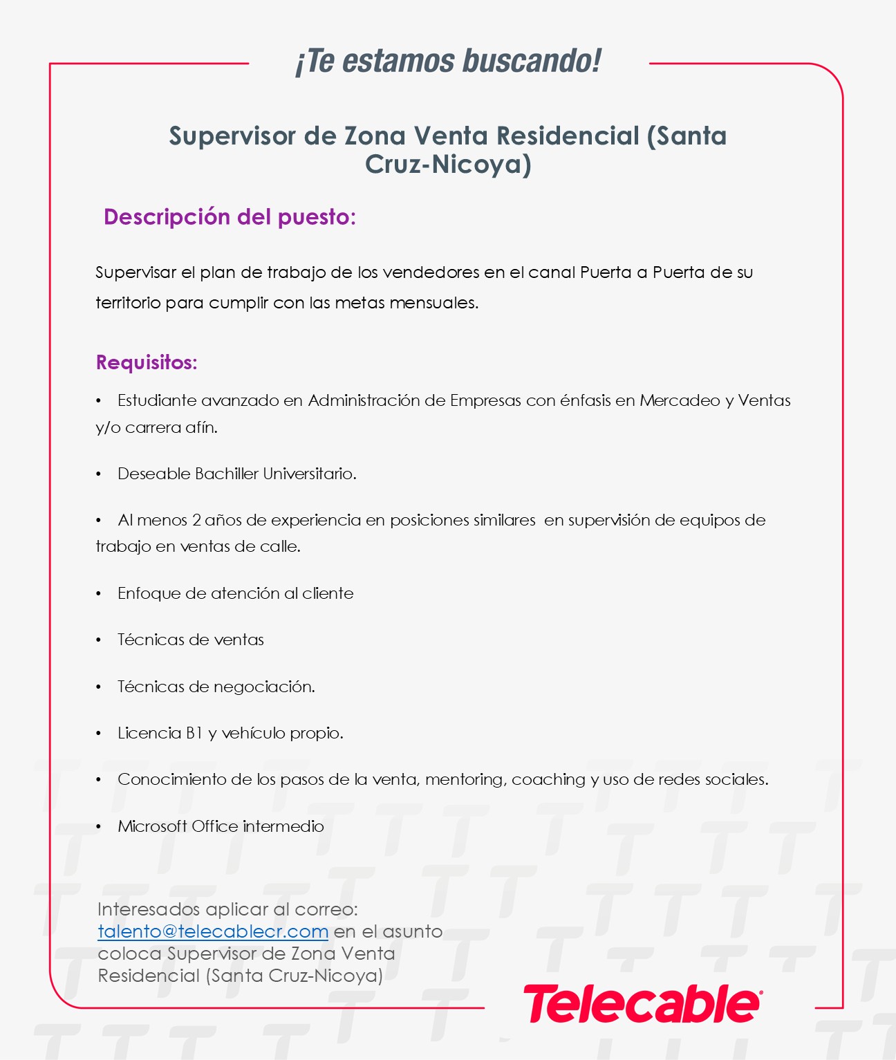 Supervisor de Ventas Residenciales. Telecable