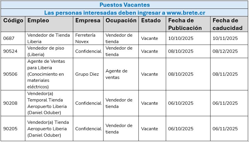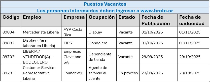 La Municipalidad de Liberia y la Unidad de Intermediación de Empleo los invita a revisar opciones laborales para ver opciones de puestos puede inggresar a www.brete.cr
